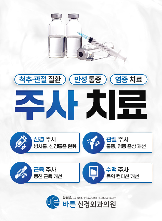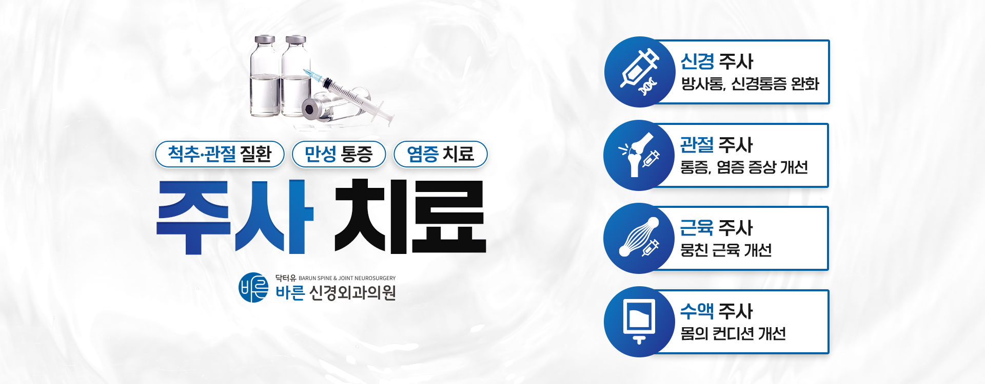 주사치료는 통증 부위에 약물을 정확히 투여해 염증과 통증을 줄여주는 치료로 만성통증 뿐만 아니라 다양한 척추/관절 질환에도 사용됩니다. 관절주사./인대강화주사/근육주사/수액주사 등 종류가 다양합니다.